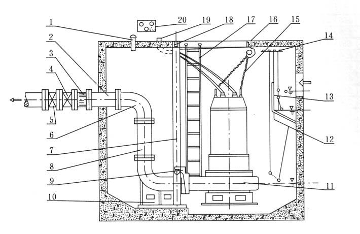 12.浮球(qiú)開關(水位開(kāi)關)13.隔闆 14.浮球(qiú)固定架 15.小鍊(lian) 16.挂鈎 17.人梯 18.支(zhi)撐架 19.電纜出(chu)線管 20.電機保(bǎo)護器