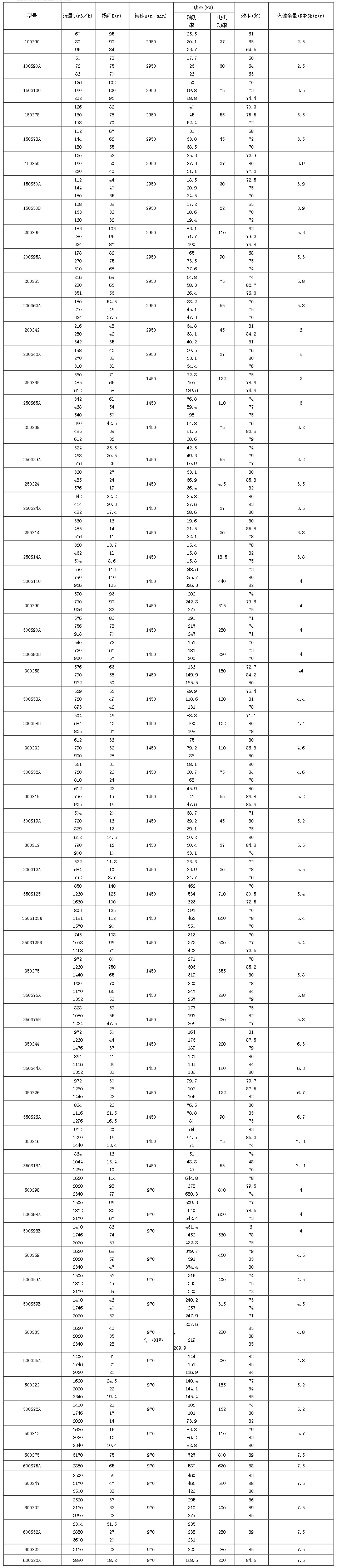S、SH型(xíng)雙吸中開泵型(xíng)号參數:
