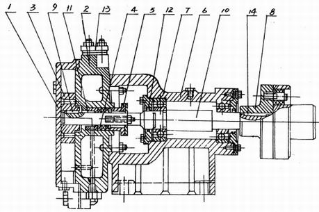 8. 聯軸(zhóu)器 9.葉輪(lun)平健 10.泵(bèng)軸 11.填料(liào)環 12.軸承(chéng)壓蓋 13.法(fǎ)蘭盤 14.聯(lián)軸器平(ping)健