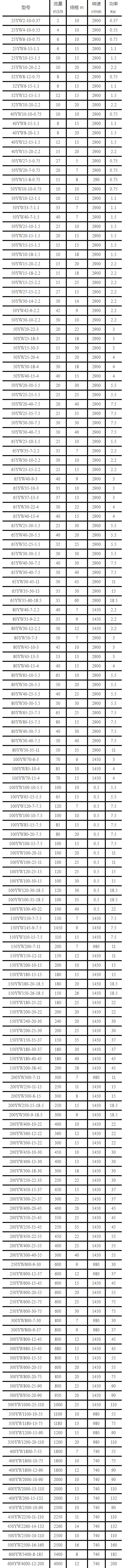 YW無堵塞液下(xià)排污泵性能(neng)參數表